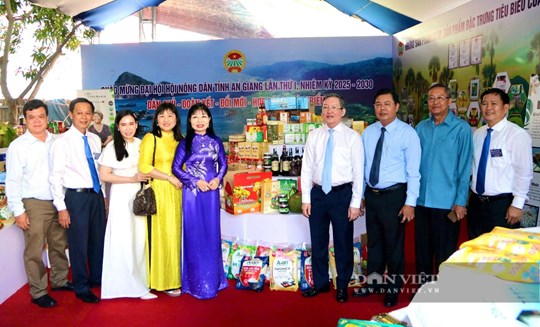 | Lãnh đạo Trung ương Hội Nông dân Việt Nam, lãnh đạo tỉnh An Giang thăm và chụp ảnh lưu niệm tại gian hàng trưng bày của nông dân bên lề đại hội. Ảnh: Hồng Cẩm |