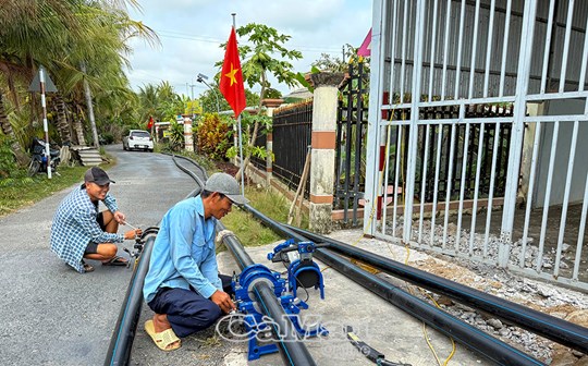 | Công nhân thi công đường ống cấp nước sạch về ấp Ninh Ðiền, xã Ninh Quới |