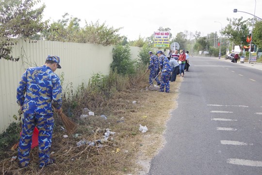 | Cán bộ, chiến sĩ Lữ đoàn 681 tham gia vệ sinh môi trường trên địa bàn phường Tiến Thành |