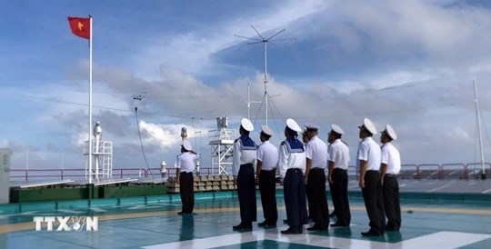 | Lễ chào cờ tại Nhà giàn DK1/21. (Ảnh: TTXVN phát) |