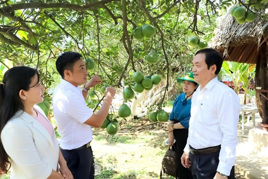 | Nông dân trên địa bàn tỉnh tham quan mô hình sản xuất giỏi tại vườn bưởi đặc sản Tân Triều, phường Tân Triều. Ảnh: Bình Nguyên |