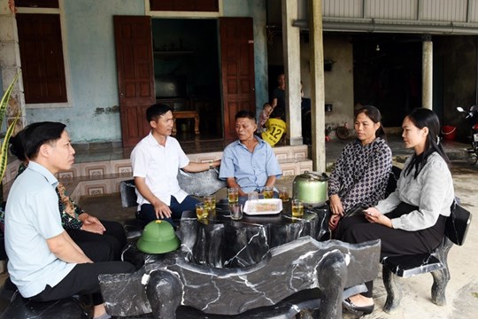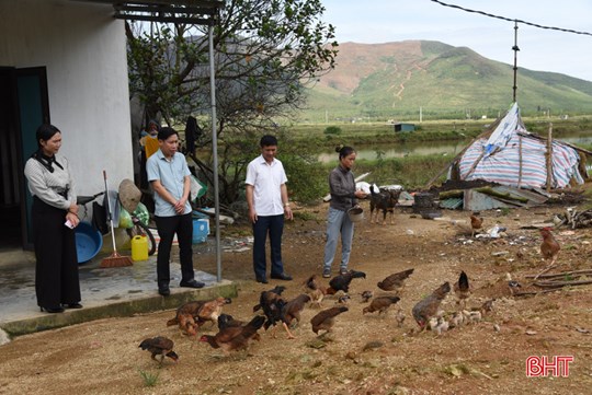 | Lãnh đạo xã Kỳ Khang động viên, chia sẻ với chị Lê Thị Hà (thôn Sơn Bắc) có chồng bị bệnh K, 2 con đang học đại học (gia đình vừa được hỗ trợ bò, tạo sinh kế) |