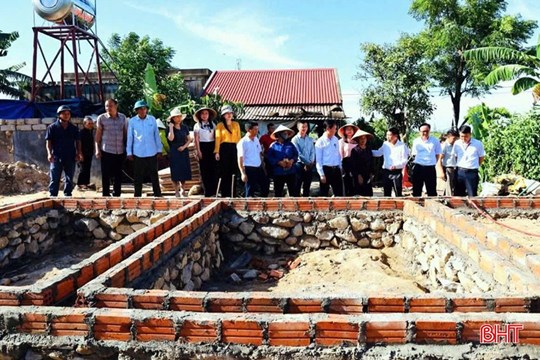| Lãnh đạo xã Kỳ Khang đến động viên, chia sẻ gia đình hộ nghèo trên địa bàn được hỗ trợ xây dựng nhà ở mới |