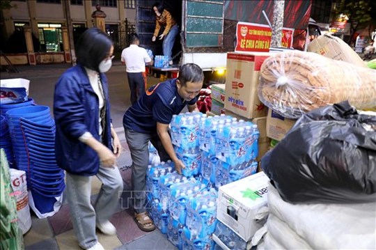 | Thành viên Câu lạc bộ Tình nguyện Thái Bình vận chuyển các vật phẩm lên xe để mang đến đồng bào vùng lũ. Ảnh: Thế Duyệt/TTXVN |