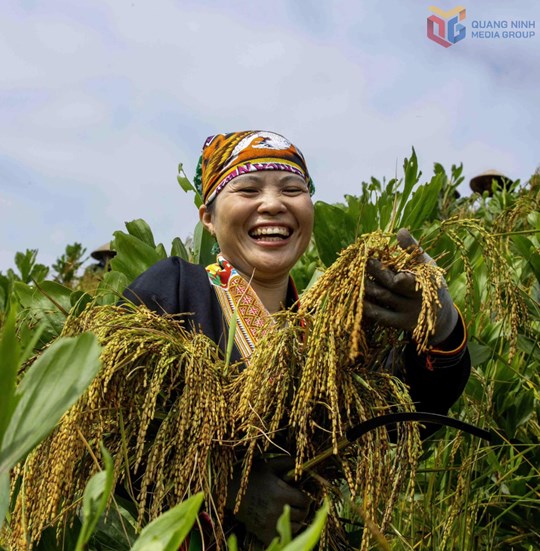 | Một phụ nữ người Dao Thanh Phán phấn khởi vì được mùa lúa nương. |