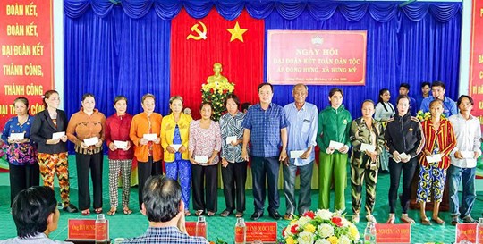| Phó Bí thư Thường trực Tỉnh ủy, Chủ tịch Ủy ban MTTQ Việt Nam tỉnh Cà Mau Huỳnh Quốc Việt tặng quà cho hộ nghèo tại Ngày hội Đại đoàn kết toàn dân tộc ở khu dân cư ấp Đông Hưng, xã Hưng Mỹ. |