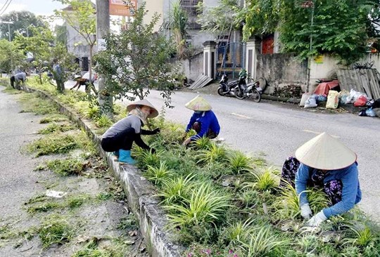 Người dân khu Trung Chính xã Phùng Nguyên thường xuyên dọn vệ sinh, cắt tỉa hoa thực hiện mô hình “5 có 3 sạch” tại các khu dân cư |