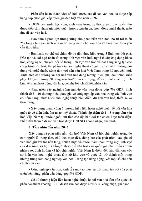 Nghị quyết đề ra mục tiêu đến năm 2030 xây dựng nền văn hóa Việt Nam tiên tiến, đậm đà bản sắc dân tộc; phát triển mạnh các ngành công nghiệp văn hóa; thu hẹp chênh lệch trong thụ hưởng văn hóa giữa các vùng, miền; từng bước hình thành các thương hiệu văn hóa, nghệ thuật, sáng tạo có tầm vóc khu vực và quốc tế. Tầm nhìn đến năm 2045 là xây dựng nền văn hóa Việt Nam xã hội chủ nghĩa, trong đó con người là trung tâm, chủ thể và mục tiêu của phát triển; văn hóa trở thành sức mạnh mềm nổi bật, góp phần khẳng định vị thế Việt Nam là quốc gia phát triển, có thu nhập cao.