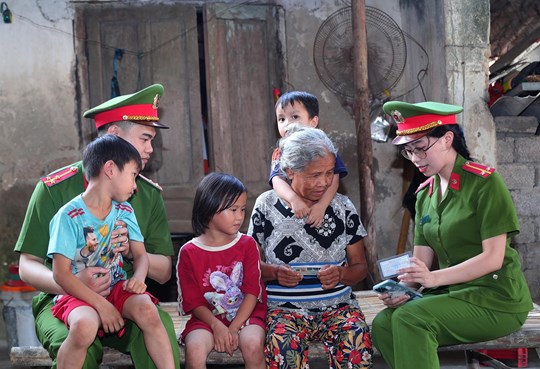 | Cán bộ công an xã đến tận hộ gia đình tuyên truyền, hướng dẫn người dân thực hiện các thủ tục hành chính trên môi trường điện tử_Ảnh: TTXVN |