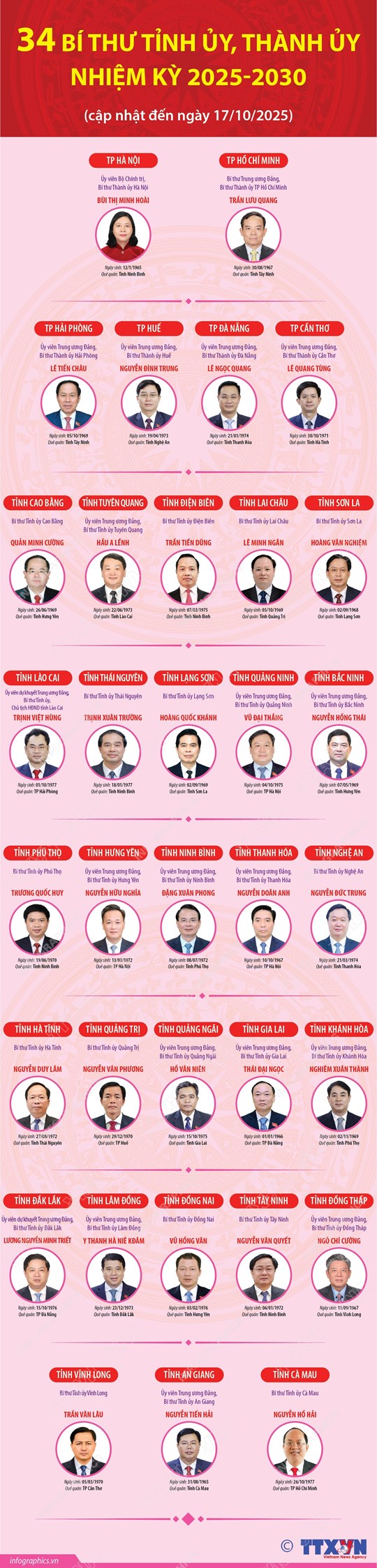 (Mặt trận) - Ban biên tập trân trọng giới thiệu danh sách 34 Bí thư Tỉnh ủy, Thành ủy nhiệm kỳ 2025-2030.