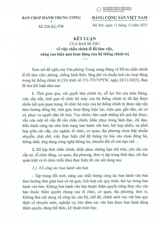 (Mặt trận) - Ngày 11/12/2025, đồng chí Thường trực Ban Bí thư Trần Cẩm Tú ký ban hành Kết luận số 226-KL/TW về việc chấn chỉnh lề lối làm việc, nâng cao hiệu quả hoạt động của hệ thống chính trị. Ban Biên tập trân trọng đăng nội dung Kết luận: