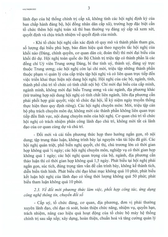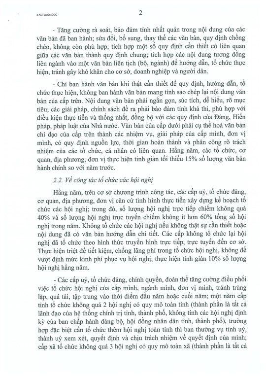 - Các cấp uỷ, tổ chức đảng, chính quyền, đoàn thể tăng cường điều phối việc tổ chức hội nghị của cấp mình, ngành mình, đơn vị mình, tránh trùng lặp, quá tải, tập trung vào thời điểm đầu năm hoặc cuối năm; một năm cấp tỉnh tổ chức không quá 2 hội nghị có quy mô toàn tỉnh (thành phần là tất cả lãnh đạo của hệ thống chính trị tỉnh, thành phố, không tính các hội nghị định kỳ của ban chấp hành đảng bộ, hội đồng nhân dân tỉnh, thành phố), trường hợp đặc biệt cần tổ chức thêm hội nghị toàn tỉnh thì ban thường vụ tỉnh uỷ, thành uỷ xem xét, quyết định và chịu trách nhiệm về quyết định của mình; cấp xã tổ chức không quá 3 hội nghị có quy mô toàn xã (thành phần là tất cả lãnh đạo của hệ thống chính trị cấp xã, không tính các hội nghị định kỳ của ban chấp hành đảng bộ, hội đồng nhân dân cấp xã), trường hợp đặc biệt cần tổ chức thêm hội nghị toàn xã thì ban thường vụ đảng ủy cấp xã xem xét, quyết định và chịu trách nhiệm về quyết định của mình.