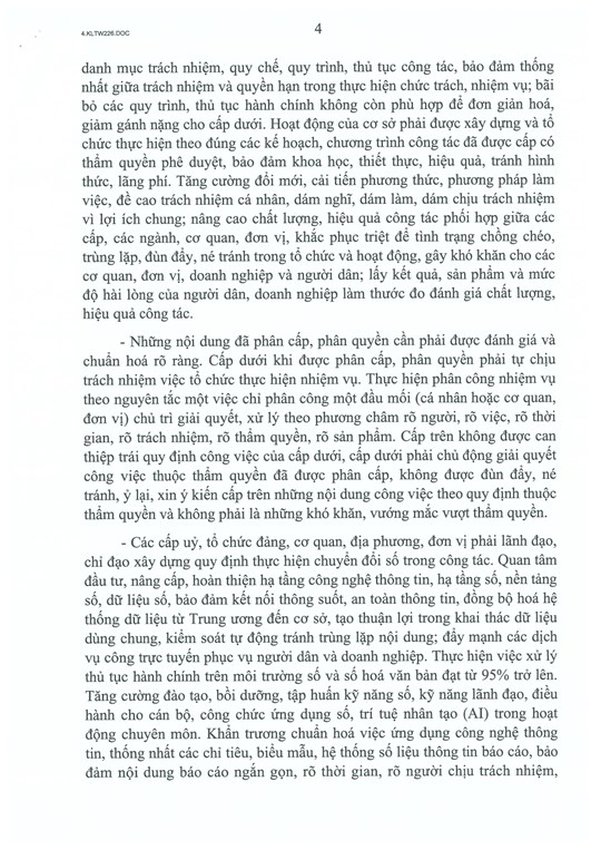 - Các cấp ủy, tổ chức đảng, cơ quan, địa phương, đơn vị phải lãnh đạo, chỉ đạo xây dựng quy định thực hiện chuyển đổi số trong công tác. Quan tâm đầu tư, nâng cấp, hoàn thiện hạ tầng công nghệ thông tin, hạ tầng số, nền tảng số, dữ liệu số, bảo đảm kết nối thông suốt, an toàn thông tin, đồng bộ hóa hệ thống dữ liệu từ Trung ương đến cơ sở, tạo thuận lợi trong khai thác dữ liệu dùng chung, kiểm soát tự động tránh trùng lặp nội dung; đẩy mạnh các dịch vụ công trực tuyến phục vụ người dân và doanh nghiệp. Thực hiện việc xử lý thủ tục hành chính trên môi trường số và số hóa văn bản đạt từ 95% trở lên. Tăng cường đào tạo, bồi dưỡng, tập huấn kỹ năng số, kỹ năng lãnh đạo, điều hành cho cán bộ, công chức ứng dụng số, trí tuệ nhân tạo (AI) trong hoạt động chuyên môn. Khẩn trương chuẩn hóa việc ứng dụng công nghệ thông tin, thống nhất các chỉ tiêu, biểu mẫu, hệ thống số liệu thông tin báo cáo, bảo đảm nội dung báo cáo ngắn gọn, rõ thời gian, rõ người chịu trách nhiệm, định lượng được kết quả và giảm được số lượng báo cáo; thực hiện 100% văn bản ban hành và báo cáo định kỳ, thông tin truyền tải giữa các cấp qua môi trường mạng.