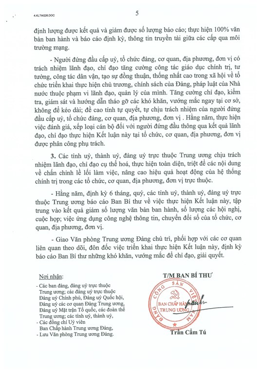 - Hằng năm, định kỳ 6 tháng, quý, các tỉnh ủy, thành uỷ, đảng ủy trực thuộc Trung ương báo cáo Ban Bí thư về việc thực hiện Kết luận này, tập trung vào kết quả giảm số lượng văn bản ban hành, số lượng các hội nghị, cuộc họp; việc ứng dụng công nghệ thông tin, chuyển đổi số của tổ chức, cơ quan, địa phương, đơn vị.