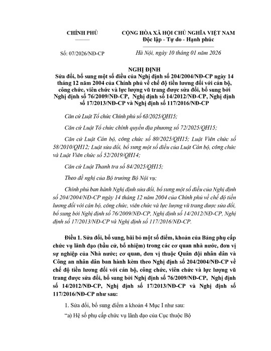 (Mặt trận) - Chính phủ ban hành Nghị định 07/2026/NĐ-CP sửa đổi, bổ sung một số điều của Nghị định số 204/2004/NĐ-CP ngày 14/12/2004 của Chính phủ về chế độ tiền lương đối với cán bộ, công chức, viên chức và lực lượng vũ trang được sửa đổi, bổ sung bởi Nghị định số 76/2009/NĐ-CP, Nghị định số 14/2012/NĐ-CP, Nghị định số 17/2013/NĐ-CP và Nghị định số 117/2016/NĐ-CP.