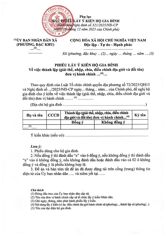 (Mặt trận) - Chính phủ ban hành Nghị định số 321/2025/NĐ-CP ngày 16/12/2025 hướng dẫn việc lấy ý kiến nhân dân về thành lập, giải thể, nhập, chia, điều chỉnh địa giới và đổi tên đơn vị hành chính. Nghị định này quy định việc tổ chức lấy ý kiến nhân dân về thành lập, giải thể, nhập, chia, điều chỉnh địa giới và đổi tên đơn vị hành chính.