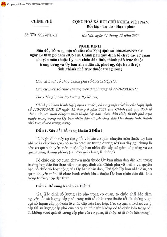 (Mặt trận) - Nghị định số 370/2025/NĐ-CP ngày 31/12/2025 sửa đổi, bổ sung một số điều của Nghị định số 150/2025/NĐ-CP quy định tổ chức các cơ quan chuyên môn thuộc UBND tỉnh, thành phố trực thuộc trung ương và UBND xã, phường, đặc khu thuộc tỉnh, thành phố trực thuộc trung ương.