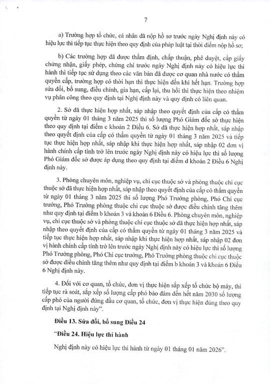 Phòng chuyên môn, nghiệp vụ, chi cục thuộc sở và phòng thuộc chi cục thuộc sở đã thực hiện hợp nhất, sáp nhập theo quyết định của cấp có thẩm quyền từ ngày 1/3/2025 thì số lượng Phó Trưởng phòng, Phó Chi cục trưởng, Phó Trưởng phòng thuộc chi cục thuộc sở được điều chỉnh tăng thêm như quy định tại điểm b mục 3 và mục 6 ở trên. Phòng chuyên môn, nghiệp vụ, chi cục thuộc sở và phòng thuộc chi cục thuộc sở đã thực hiện hợp nhất, sáp nhập theo quyết định của cấp có thẩm quyền từ ngày 1/3/2025 và tiếp tục thực hiện hợp nhất, sáp nhập khi thực hiện hợp nhất, sáp nhập 02 đơn vị hành chính cấp tỉnh trở lên trước ngày Nghị định này có hiệu lực thì số lượng Phó Trưởng phòng, Phó Chi cục trưởng, Phó Trưởng phòng thuộc chi cục thuộc sở được điều chỉnh tăng thêm như quy định tại điểm b mục 3 và mục 6 ở trên.