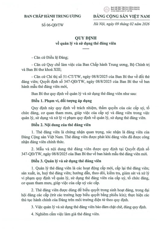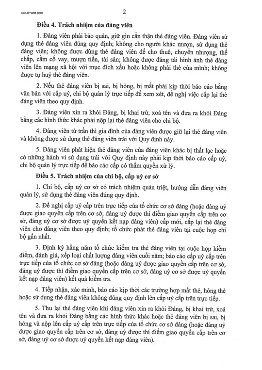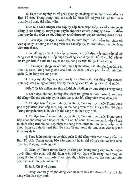 Quy định số 06-QĐ/TW quy định về trách nhiệm, thẩm quyền của các cấp uỷ, tổ chức đảng, cơ quan tham mưu, giúp việc của cấp uỷ và đảng viên trong việc quản lý, sử dụng và xử lý vi phạm quy định về quản lý, sử dụng thẻ đảng viên.