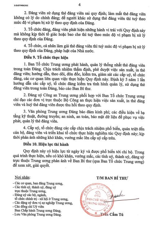 Quy định cũng nêu rõ các trường hợp xử lý vi phạm gồm: Đảng viên tự ý trả thẻ đảng viên hoặc tự huỷ thẻ đảng viên bị xoá tên đảng viên theo quy định; Đảng viên sử dụng thẻ đảng viên sai quy định; làm mất thẻ đảng viên không có lý do chính đáng; để người khác sử dụng thẻ đảng viên thì tuỳ theo mức độ vi phạm bị xử lý theo quy định của Đảng.