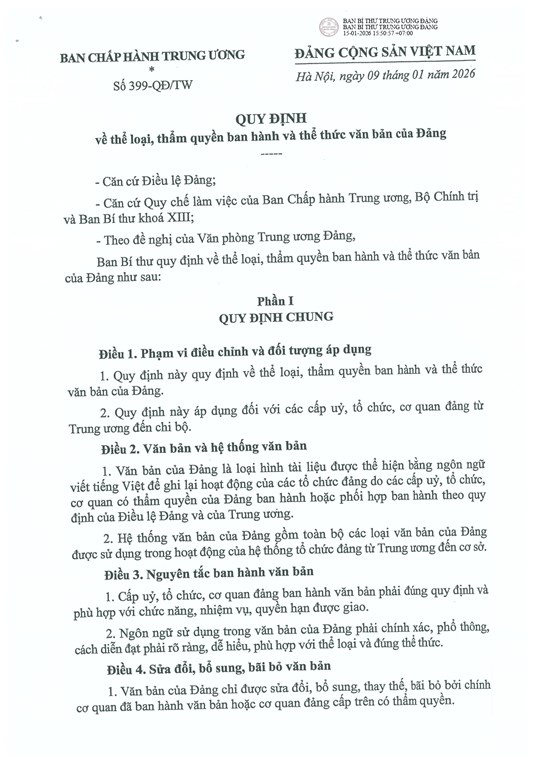 Toàn văn: Quy định số 399-QĐ/TW của Ban Bí thư về thể loại, thẩm quyền ban hành và thể thức văn bản của Đảng