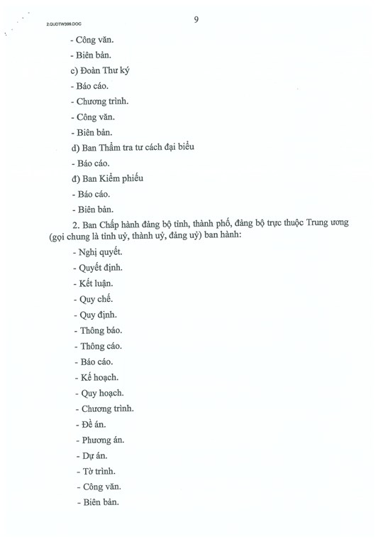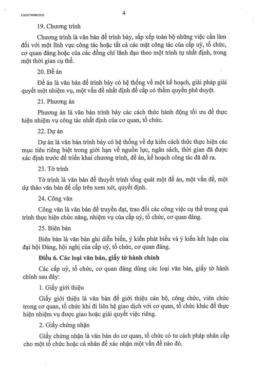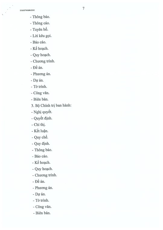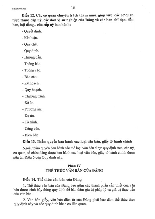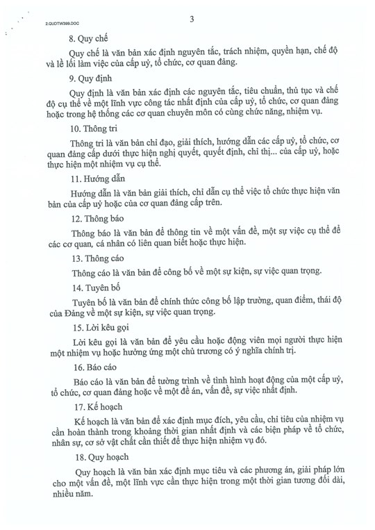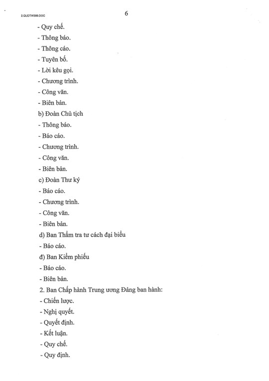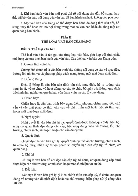 Trong đó, Điều 5 quy định các thể loại văn bản của Đảng gồm: cương lĩnh chính trị, điều lệ Đảng, chiến lược, nghị quyết, quyết định, chỉ thị, kết luận, quy chế, quy định, thông tri, hướng dẫn, thông báo, thông cáo, tuyên bố, lời kêu gọi, báo cáo, kế hoạch, quy hoạch, chương trình, đề án, phương án, dự án, tờ trình, công văn, biên bản.