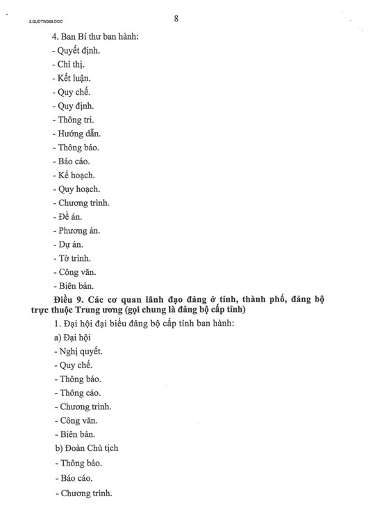 Điều 9, quy định thẩm quyền ban hành văn bản của các cơ quan lãnh đạo đảng ở tỉnh, thành phố, đảng bộ trực thuộc trung ương (gọi chung là đảng bộ cấp tỉnh), gồm: Đại hội đại biểu đảng bộ cấp tỉnh; Ban Chấp hành đảng bộ tỉnh, thành phố, đảng bộ trực thuộc Trung ương; Ban Thường vụ tỉnh ủy, thành ủy, đảng ủy trực thuộc Trung ương.
