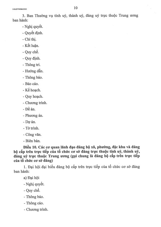 Điều 10, quy định thẩm quyền ban hành văn bản của các cơ quan lãnh đạo đảng bộ xã, phường, đặc khu và đảng bộ cấp trên trực tiếp của tổ chức cơ sở đảng trực thuộc tỉnh ủy, thành ủy, đảng ủy trực thuộc Trung ương (gọi là đảng bộ cấp trên trực tiếp của tổ chức cơ sở Đảng).
