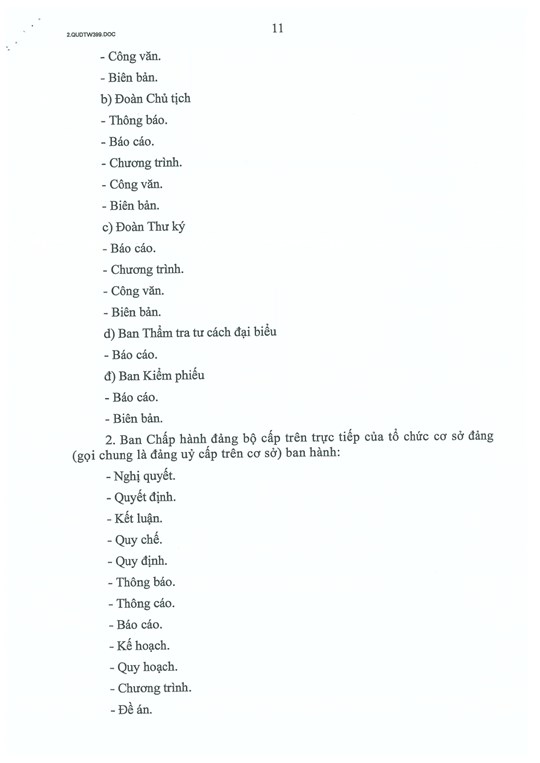 Điều 11, quy định thẩm quyền ban hành văn bản của các cơ quan lãnh đạo đảng cấp cơ sở, các tổ chức đảng trực thuộc đảng ủy và cấp trên cơ sở.