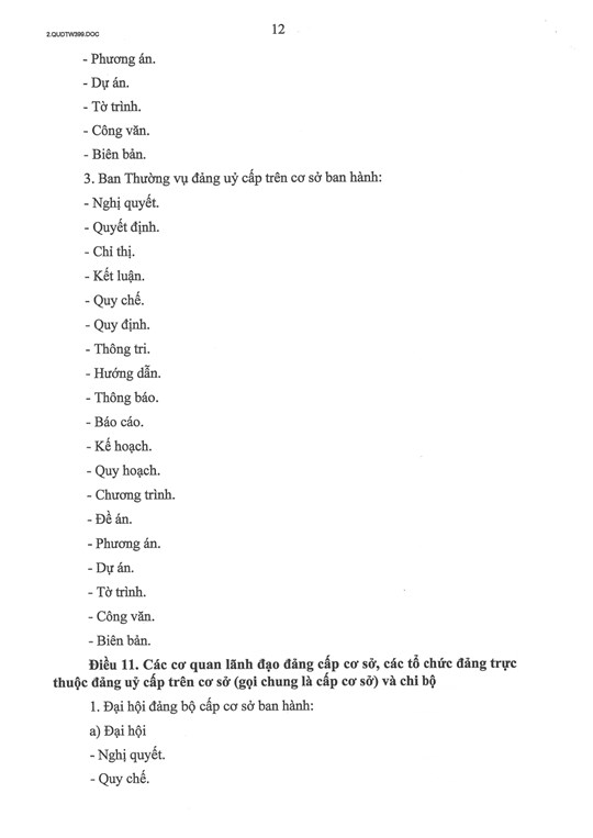 Điều 12, quy định thẩm quyền ban hành văn bản của các cơ quan chuyên trách tham mưu, giúp việc, các cơ quan trực thuộc cấp ủy, các đơn vị sự nghiệp của Đảng và các ban chỉ đạo, tiểu ban, hội đồng,... của cấp ủy ban hành.