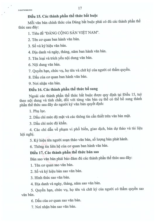 Điều 15, quy định về các thành phần thể thức bắt buộc đối với văn bản của Đảng. Theo đó, mỗi văn bản chính thức của Đảng bắt buộc phải có các thành phần thể thức sau đây: