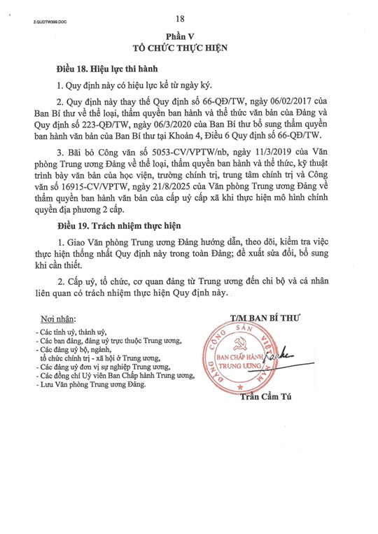 (Mặt trận) - Thường trực Ban Bí thư Trần Cẩm Tú đã ký ban hành Quy định số 399-QĐ/TW về thể loại, thẩm quyền ban hành và thể thức văn bản của Đảng.