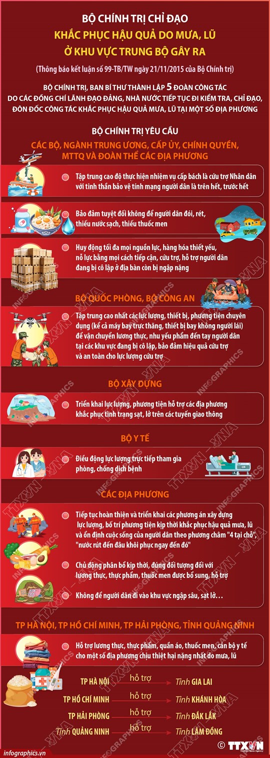 4. Bộ Chính trị, Ban Bí thư thành lập 5 đoàn công tác do các đồng chí lãnh đạo Đảng, Nhà nước tiếp tục đi kiểm tra, chỉ đạo, đôn đốc công tác khắc phục hậu quả mưa, lũ tại một số địa phương; trước mắt giao cho một số địa phương thực hiện nhiệm vụ trực tiếp hỗ trợ chi viện về lương thực, thực phẩm, quần áo, thuốc men, cán bộ y tế cho một số địa phương chịu thiệt hại nặng nhất do mưa, lũ như sau: Thành phố Hà Nội hỗ trợ tỉnh Gia Lai; Thành phố Hồ Chí Minh hỗ trợ tỉnh Khánh Hoà; thành phố Hải Phòng hỗ trợ tỉnh Đắk Lắk; tỉnh Quảng Ninh hỗ trợ tỉnh Lâm Đồng.