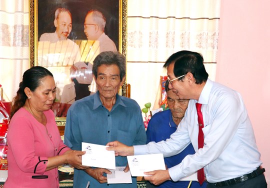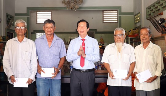 | Phó Chủ tịch UBND tỉnh An Giang Lê Văn Phước tặng quà cho gia đình chính sách, cán bộ hưu trí xã An Châu |