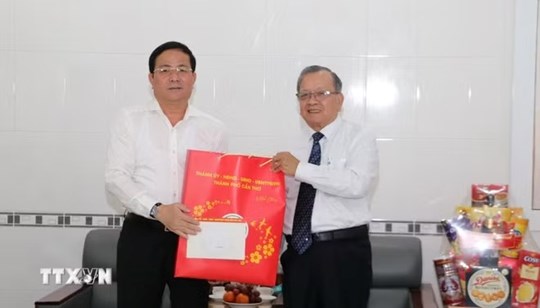 | Ông Trần Văn Huyến, Phó Bí thư Thành ủy trao quà đến đại diện Tòa Giám mục Cần Thơ. (Ảnh: Hồng Thái/TTXVN) |