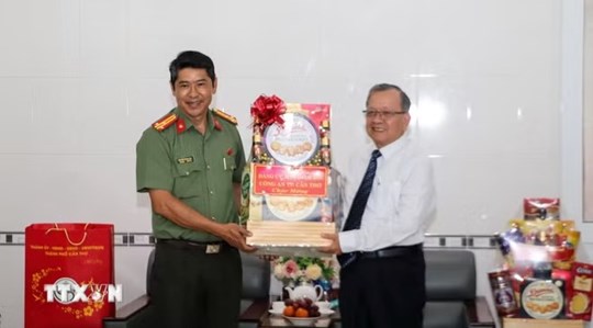 | Đại diện Công an thành phố trao quà đến đại diện Ban Đại diện Hội thánh Tin Lành Việt Nam (miền Nam) thành phố Cần Thơ. (Ảnh: Hồng Thái/TTXVN) |