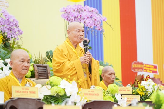 | Trưởng lão Hòa thượng Thích Thiện Nhơn - Phó Pháp chủ Hội đồng Chứng minh, Chủ tịch Hội đồng Trị sự Giáo hội Phật giáo Việt Nam phát biểu tại Đại hội |