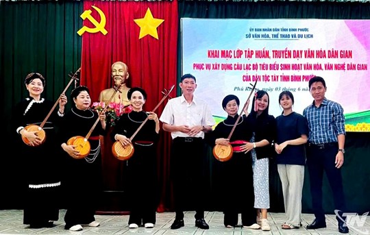 | Nghệ nhân ưu tú Mã Văn Trực truyền dạy hát then - đàn tính tại Lớp tập huấn về văn hoá dân gian của tỉnh Bình Phước, năm 2025 |