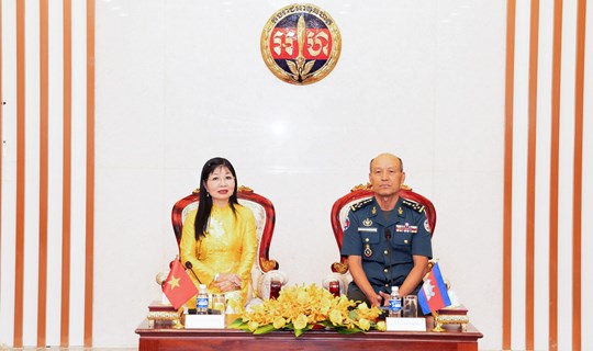 (Mặt trận) - Chiều 1/4, Đoàn Đại biểu Tỉnh ủy An Giang do Phó Bí thư Tỉnh ủy, Chủ tịch Ủy ban MTTQ Việt Nam tỉnh An Giang Trần Thị Thanh Hương làm trưởng đoàn đến thăm và chúc Tết Chôl Chnăm Thmây năm 2026 tại Bộ Tư lệnh Hiến binh - Quân đội Hoàng gia Campuchia. Đại tướng Sao Sokha, Tư lệnh Bộ Tư lệnh Hiến binh - Quân đội Hoàng gia Campuchia tiếp đoàn.