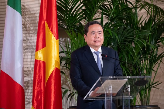 Phát biểu tại buổi gặp mặt, Chủ tịch Quốc hội Trần Thanh Mẫn gửi lời chúc mừng nồng nhiệt đến toàn thể cán bộ, nhân viên Đại sứ quán cùng cộng đồng người Việt Nam tại Italia, trân trọng chuyển lời thăm hỏi của Tổng Bí thư, Chủ tịch nước Tô Lâm tới toàn thể cộng đồng người Việt Nam tại Italia.