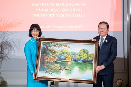 (Mặt trận) - Trưa 14/4, giờ địa phương, chiều cùng ngày giờ Việt Nam, trong chuyến thăm chính thức Italia, Chủ tịch Quốc hội Trần Thanh Mẫn và Phu nhân Nguyễn Thị Thanh Nga đã gặp mặt cộng đồng người Việt Nam và cán bộ, nhân viên Đại sứ quán Việt Nam tại Italia.