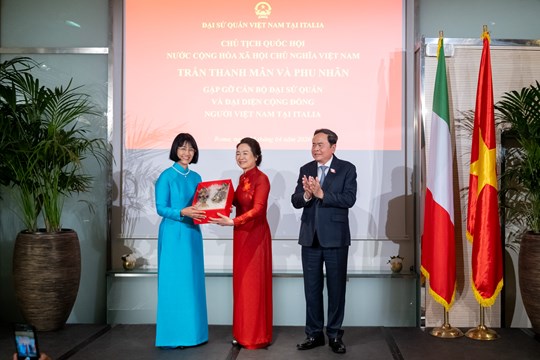 | Chủ tịch Quốc hội Trần Thanh Mẫn trao quà lưu niệm tặng Đại sứ quán Việt Nam tại Italia |