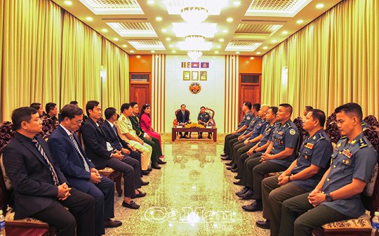 | Các đại biểu chụp ảnh lưu niệm tại Tổng cục Dịch vụ quân sự (Bộ Quốc phòng Quân đội Hoàng gia Campuchia) chụp ảnh lưu niệm. |