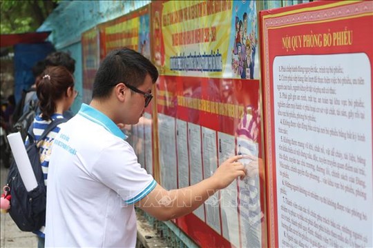 | Cử tri là sinh viên Trường Đại học Sư phạm Kỹ thuật, Đại học Đà Nẵng nghiên cứu kỹ tiểu sử, chương trình hành động của các ứng cử viên. Ảnh: Xuân Quý/TTXVN |