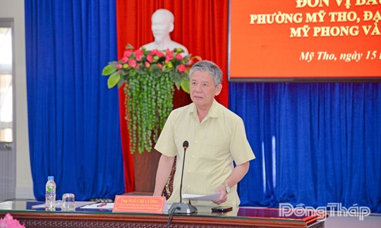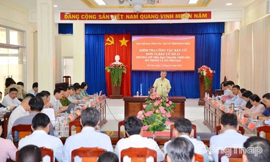 (Mặt trận) - Sáng 15/1, Ban Chỉ đạo công tác bầu cử tỉnh Đồng Tháp kiểm tra công tác bầu cử đơn vị bầu cử số 23 (gồm các phường: Mỹ Tho, Đạo Thạnh, Thới Sơn, Mỹ Phong và xã Chợ Gạo). Ông Ngô Chí Cường, Ủy viên Ban Chấp hành Trung ương Đảng, Bí thư Tỉnh ủy, Trưởng đoàn Đại biểu Quốc hội đơn vị tỉnh Đồng Tháp, Trưởng Ban Chỉ đạo làm trưởng đoàn kiểm tra.