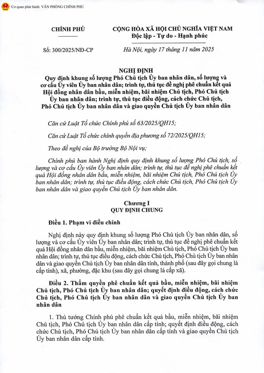 (Mặt trận) - Chính phủ ban hành Nghị định số 300/2025/NĐ-CP quy định khung số lượng Phó Chủ tịch UBND, số lượng và cơ cấu Ủy viên UBND; trình tự, thủ tục đề nghị phê chuẩn kết quả HĐND bầu, miễn nhiệm, bãi nhiệm Chủ tịch, Phó Chủ tịch UBND; trình tự, thủ tục điều động, cách chức Chủ tịch, Phó Chủ tịch UBND và giao quyền Chủ tịch UBND.