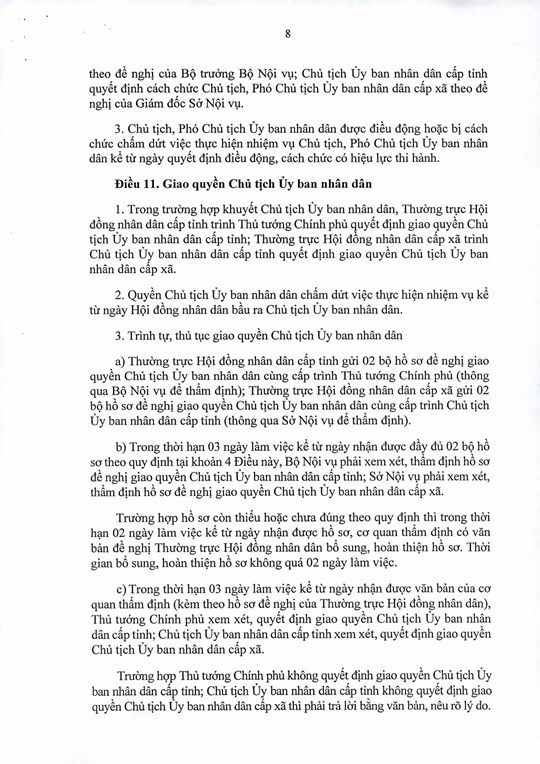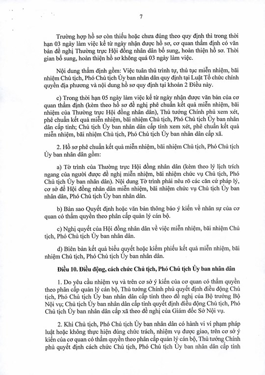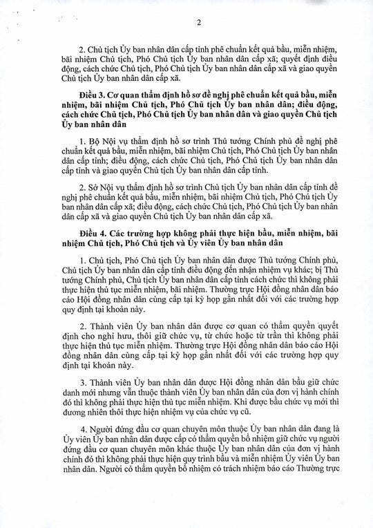 Nghị định quy định Chủ tịch, Phó Chủ tịch UBND được Thủ tướng Chính phủ, Chủ tịch Ủy ban nhân dân cấp tỉnh điều động đến nhận nhiệm vụ khác; bị Thủ tướng Chính phủ, Chủ tịch UBND cấp tỉnh cách chức thì không phải thực hiện thủ tục miễn nhiệm, bãi nhiệm. Thường trực HĐND báo cáo HĐND cùng cấp tại kỳ họp gần nhất đối với các trường hợp này.