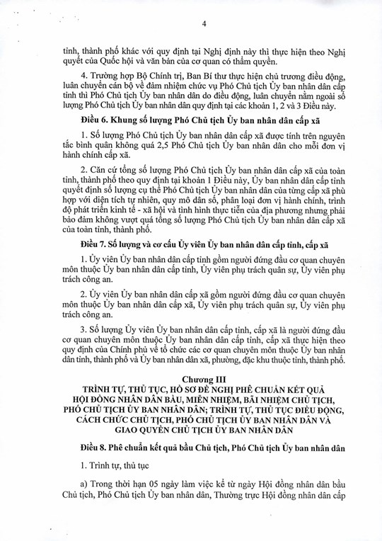 Nghị định số 300/2025/NĐ-CP gồm 4 chương, 14 điều quy định khung số lượng Phó Chủ tịch UBND, số lượng, cơ cấu Ủy viên UBND; trình tự, thủ tục đề nghị phê chuẩn kết quả HĐND bầu, miễn nhiệm, bãi nhiệm Chủ tịch, Phó Chủ tịch UBND; trình tự, thủ tục điều động, cách chức Chủ tịch, Phó Chủ tịch UBND và giao quyền Chủ tịch UBND tỉnh, thành phố, xã, phường, đặc khu.