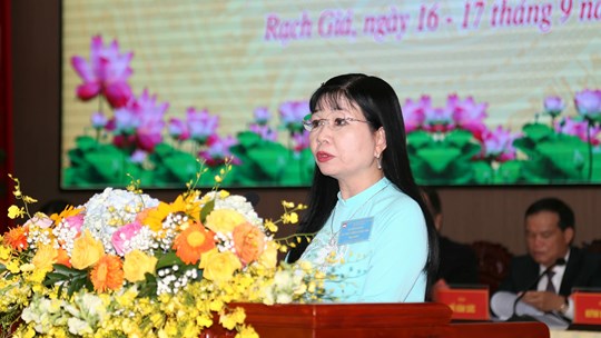Bà Trần Thị Thanh Hương - Phó Bí thư Tỉnh ủy, Chủ tịch Ủy ban MTTQ Việt Nam tỉnh An Giang phát biểu tại Đại hội |