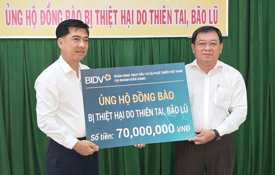 (Mặt trận) - Sáng 28/10, Ngân hàng Thương mại Cổ phần Đầu tư và Phát triển (BIDV) chi nhánh Kiên Giang đã trao 70 triệu đồng cho Ủy ban MTTQ Việt Nam tỉnh An Giang ủng hộ đồng bào khắc phục hậu quả thiên tai, bão lũ.